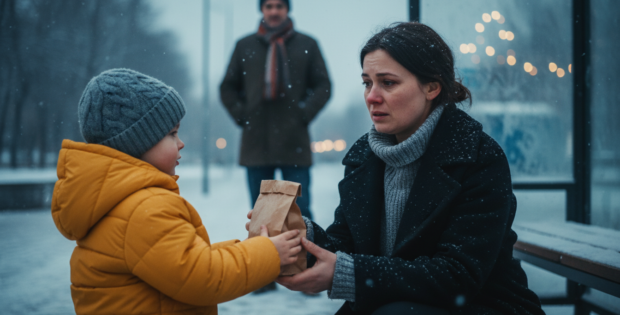 The December wind swept through the quiet streets of Riverton, pushing sharp flakes of snow through the empty sidewalks. Elena Carter sat alone on a cold metal bench